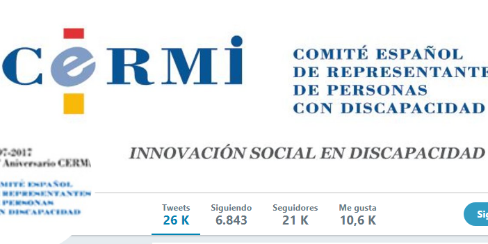 La cuenta oficial del Comité Español de Representantes de personas con Discapacidad (Cermi) en la red social Twitter (@Cermi_Estatal) ha superado los 21.000 seguidores, los cuales a través de este medio social digital reciben información sobre la actualidad e interactúan con la plataforma representativa de la discapacidad en España.